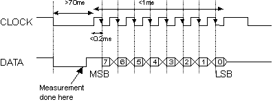 The diode can be soldered onto the green wire connected to the Vin pin of the Sharp sensor. Once the diode is soldered in place cover it with insulation tape or heat shrink tubing to prevent it making contact with any other electrical lines. The diode has a black stripe on one side, it is essential that the black strip is facing in the direction of the Robocore. The Vcc line can be connected to any 5 volt regulated output of the Robocore. The interface between the Robocore and the sensor is a serial interface. If you are familiar with serial interfaces the following timing diagram will show the sensors operation. The clock line is Vin, the Data line is Vout.
