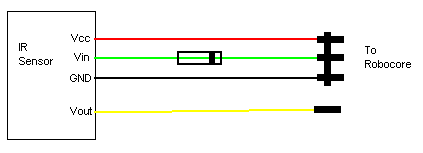 The Sharp sensor uses something called an open drain input. This is outlined in the specification tables but means that it can't directly interface with the 5 volt logic outputs of the Robocore. The open drain input Vin naturally floats high at 3 volts, where as the Robocore (or any other logic circuit) is high at 5 volts. It is Activated when it is pulled to ground. The problem is that the line can't be pulled high to 5 volts because it exceeds the maximum characteristics of the open drain circuit. If the Vin line is connected directly to the Robocore the sensor will not work. A solution to this problem is to use the diode provided to only enable the current to flow when the Robocore logic level is low. The diode stops the Vin line from being pulled too high but allows it to be pulled to ground to enable the sensor.